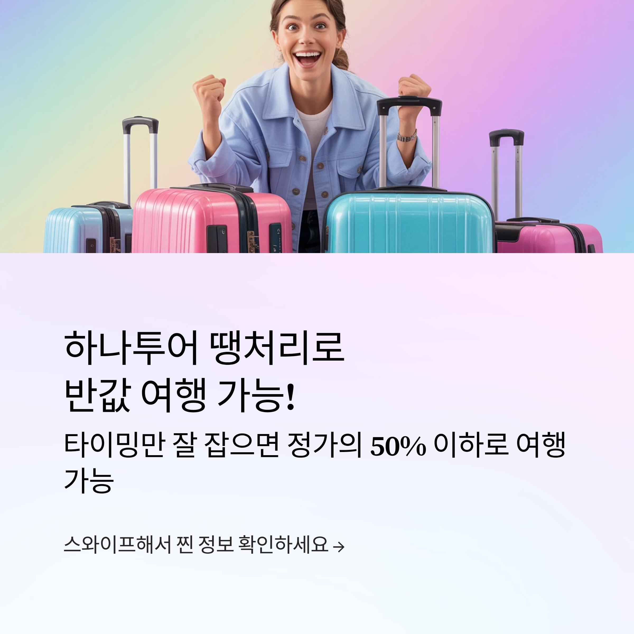 여행은 타이밍이라는 말, 딱 땡처리에 어울리는 말이에요. 정보 하나만 잘 알아도 수십만 원 절약은 물론, 더 좋은 일정으로 떠날 수 있죠. 오늘 소개한 하나투어 땡처리 팁과 링크, 꼭 저장해두셨다가 기회가 왔을 때 바로 활용해보세요. 혹시 여러분만의 땡처리 성공담이나 궁금한 점이 있다면 댓글로 남겨주세요. 함께 알차게 여행 준비해봐요 :)