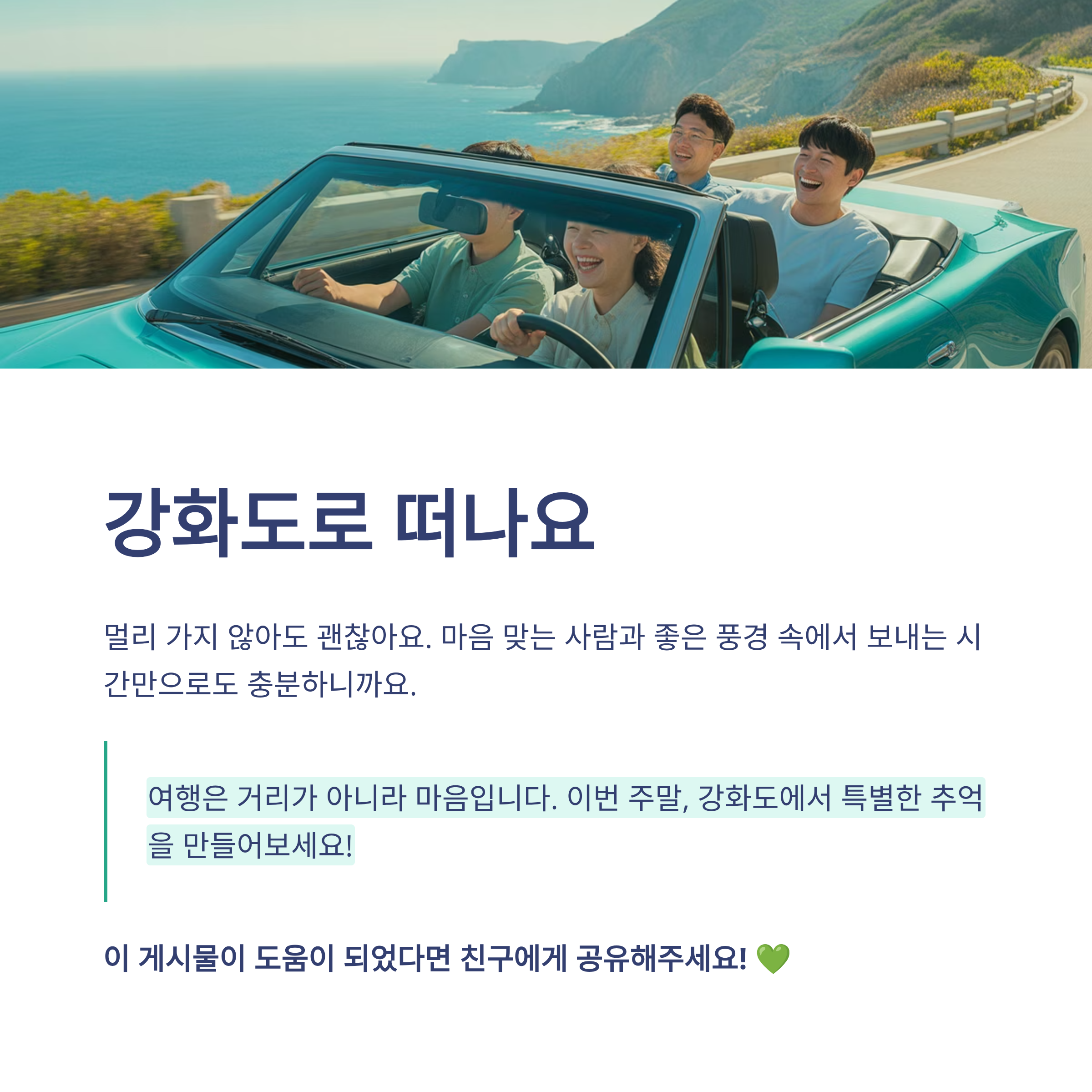 어떠셨나요? 이번 글을 통해 주말에 강화도로 가고 싶다는 생각이 조금이라도 들었다면, 저는 정말 기쁠 거예요. 직접 발로 뛰며 보고 듣고 느낀 경험을 바탕으로 쓴 만큼, 여러분의 여행이 더 알차고 즐거워졌으면 좋겠습니다. 여행은 멀리 가지 않아도 괜찮아요. 마음 맞는 사람과 좋은 풍경 속에서 보내는 그 시간만으로도 충분하니까요. 혹시 강화도에 대해 궁금한 점 있으시거나, 더 알고 싶은 지역이 있다면 댓글로 자유롭게 소통해 주세요 😊 여러분의 여행 이야기도 기다릴게요!
