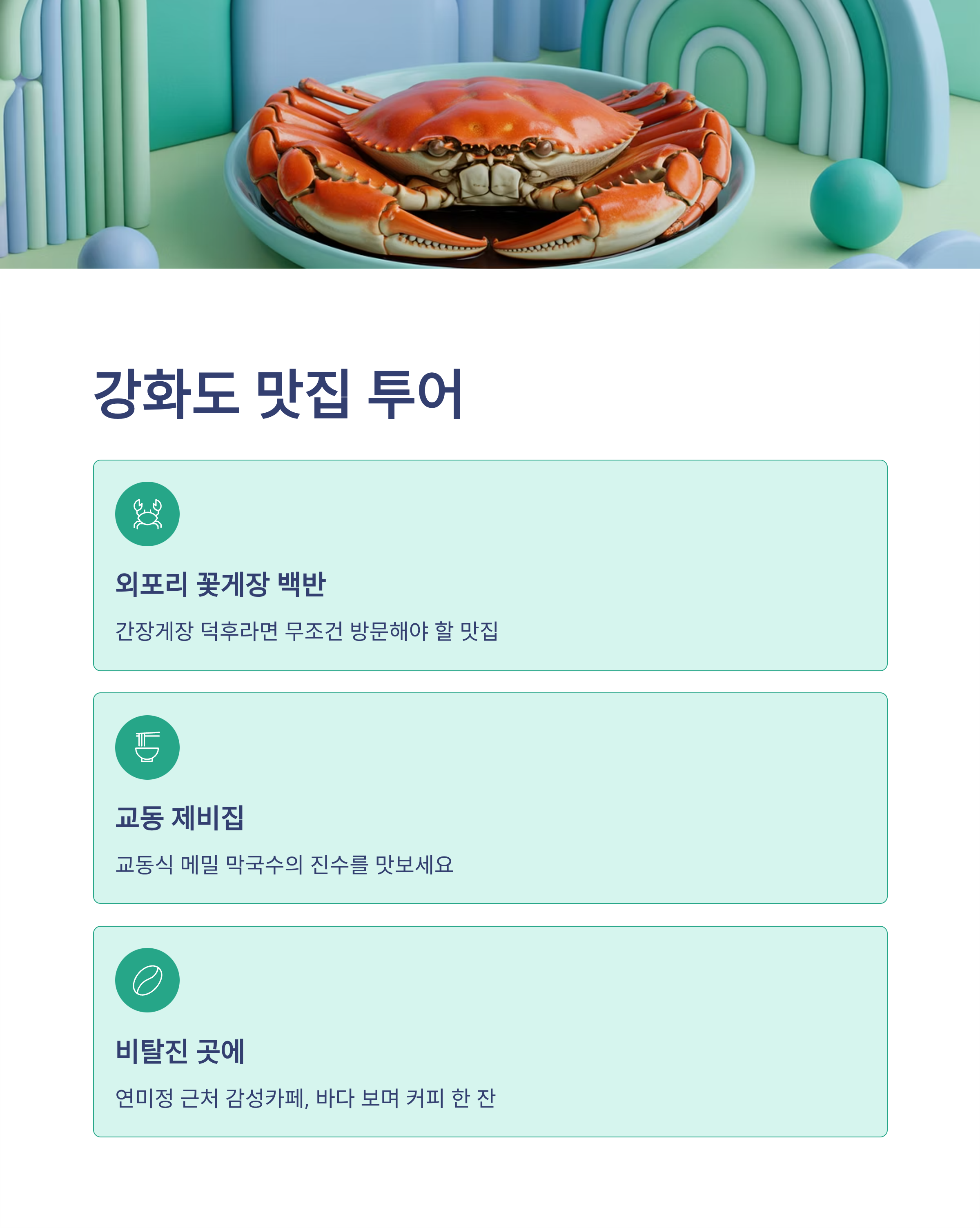 강화도는 간장게장, 밴댕이 회무침, 강화 속노랑고구마가 특히 유명해요. 현지 식당에서 꼭 맛보세요!