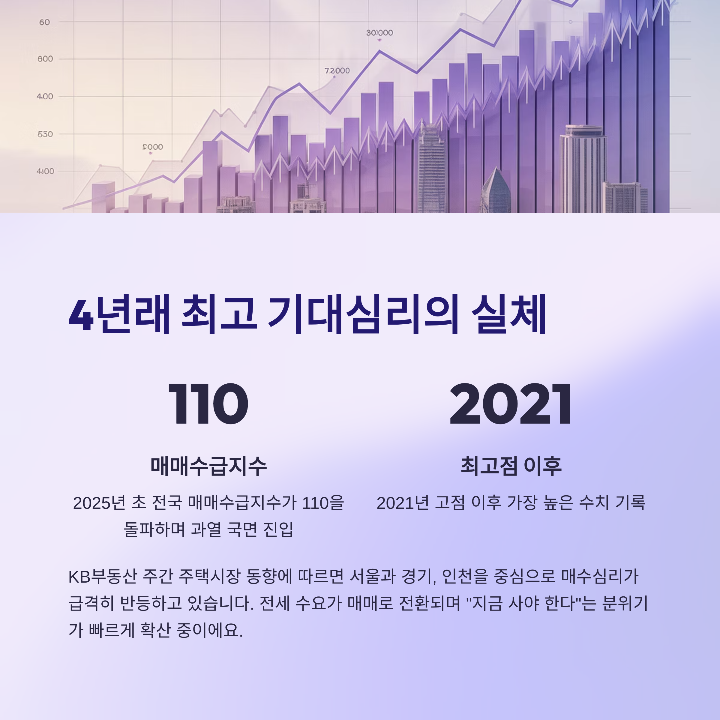 KB부동산의 주간 주택시장 동향에 따르면, 2025년 초 기준 전국 매매수급지수는 110을 돌파하며 과열 국면에 진입했습니다. 이는 2021년 고점 이후 가장 높은 수치로, 서울과 경기, 인천을 중심으로 매수심리가 급격히 반등하고 있다는 뜻입니다. 특히 전세 수요가 매매로 전환되며 "지금 사야 한다"는 분위기가 빠르게 확산 중입니다. 불안한 전세 시장과 ‘더 오르기 전에 사자’는 심리가 시세를 밀어 올리고 있다는 해석이 나오고 있습니다.