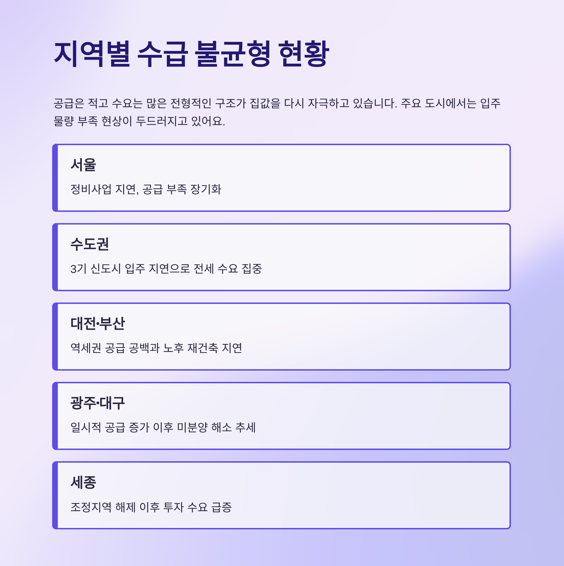 - 수도권: 3기 신도시 입주 지연 → 전세 수요 집중
