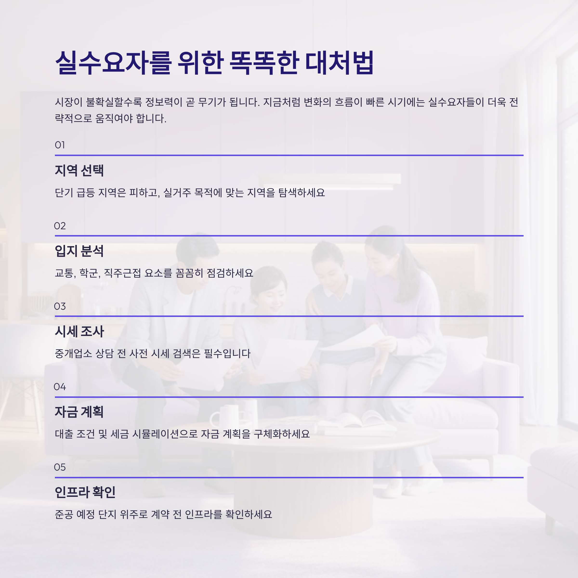 - 단기 급등 지역은 피하고, 실거주 목적에 맞는 지역을 탐색