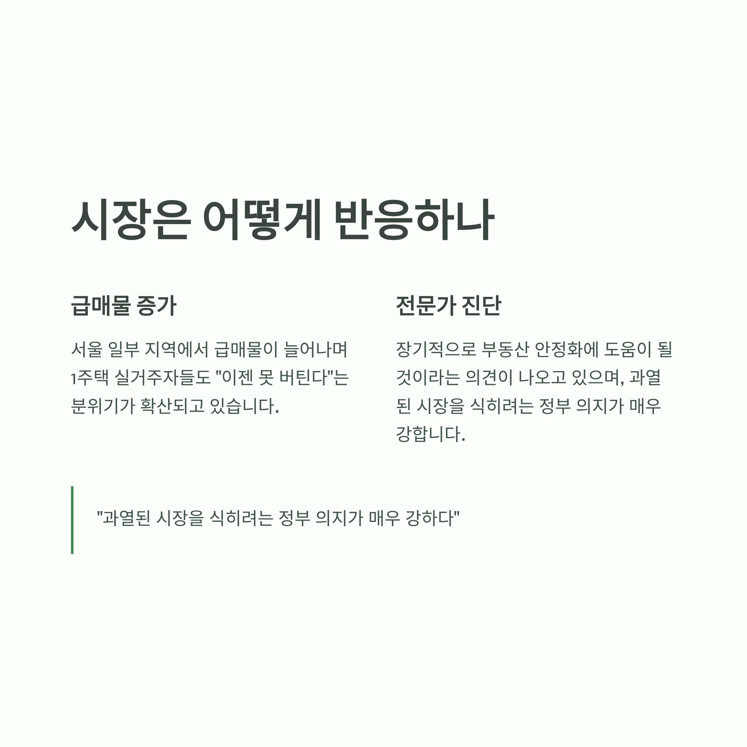 규제 발표 이후, 서울 일부 지역에서는 급매물이 늘어나고 있다고 해요. 특히 1주택 실거주자들도 “이젠 못 버틴다”는 분위기더라구요. 반면 전문가들은 “장기적으로 보면 부동산 안정화에 도움이 될 것”이라는 의견을 내놓고 있습니다. 시장 반응은 엇갈리지만, 확실한 건 과열된 시장을 식히려는 정부 의지가 매우 강하다는 점이에요.