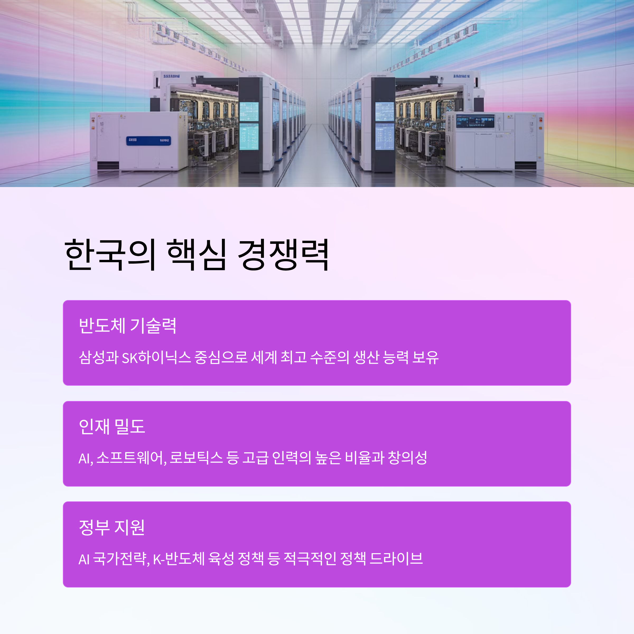 | 정부 지원 | AI 국가전략, K-반도체 육성 정책 등 적극적인 정책 드라이브 |