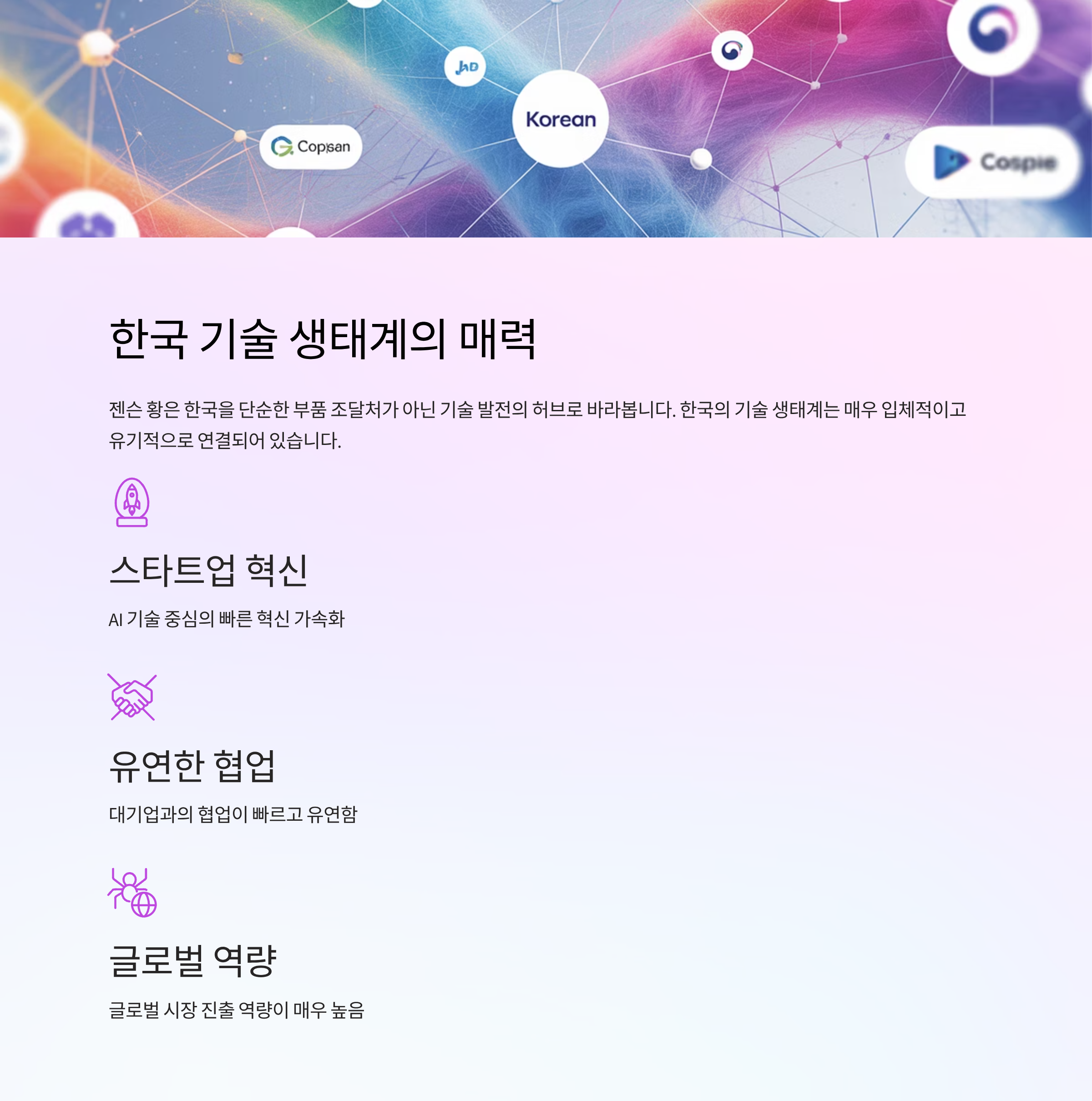 젠슨 황은 단순한 부품 조달처가 아닌, 기술 발전의 허브로서 한국을 바라보고 있어요. 그가 주목한 한국의 기술 생태계는 굉장히 입체적입니다. 하드웨어, 소프트웨어, 통신, 인공지능 스타트업까지 서로 유기적으로 연결되어 있거든요.