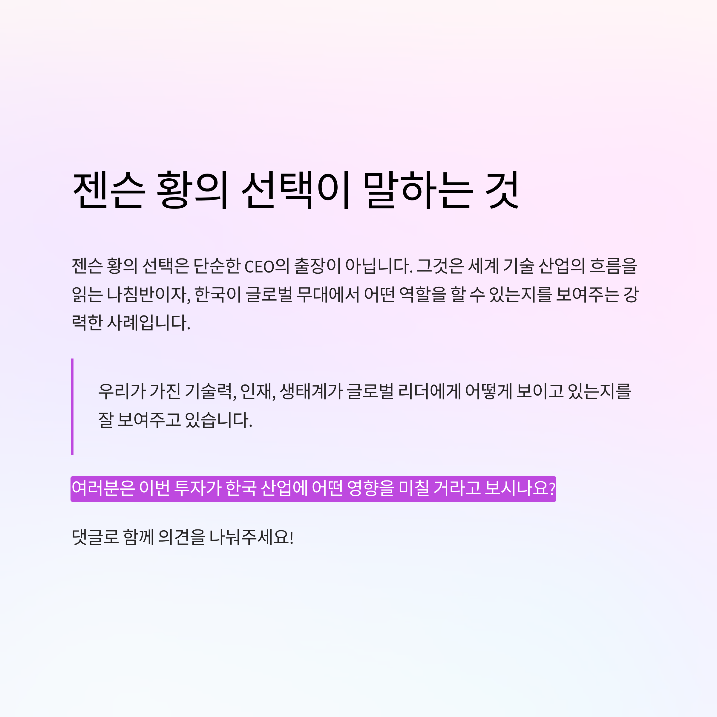 젠슨 황의 선택은 단순한 CEO의 출장이 아닙니다. 그것은 세계 기술 산업의 흐름을 읽는 나침반이자, 한국이 글로벌 무대에서 어떤 역할을 할 수 있는지를 보여주는 강력한 사례입니다. 우리가 가진 기술력, 인재, 생태계가 글로벌 리더에게 어떻게 보이고 있는지를 잘 보여주고 있어요. 앞으로 젠슨 황과 같은 거물들이 자주 한국을 찾는 이유가 더욱 명확해질 겁니다. 여러분은 이번 투자가 한국 산업에 어떤 영향을 미칠 거라고 보시나요? 댓글로 함께 의견 나눠주세요!