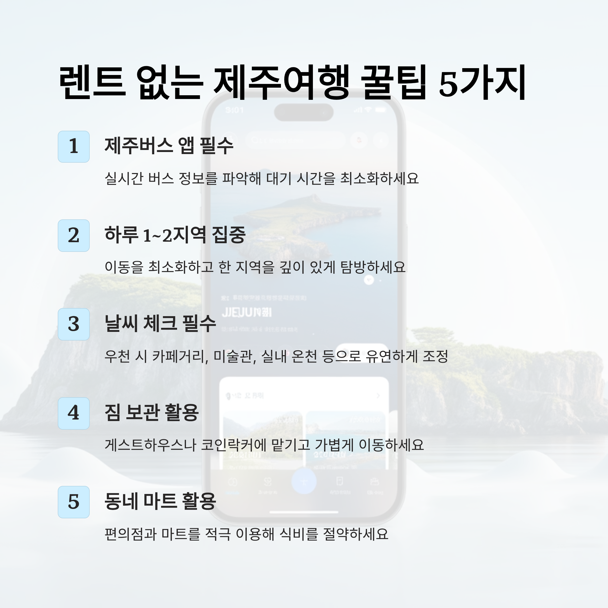 차가 없어도 불편하지 않게 제주를 즐기려면 몇 가지 팁이 필요해요. 제가 경험으로 얻은 꿀팁 다섯 가지를 정리해봤어요!