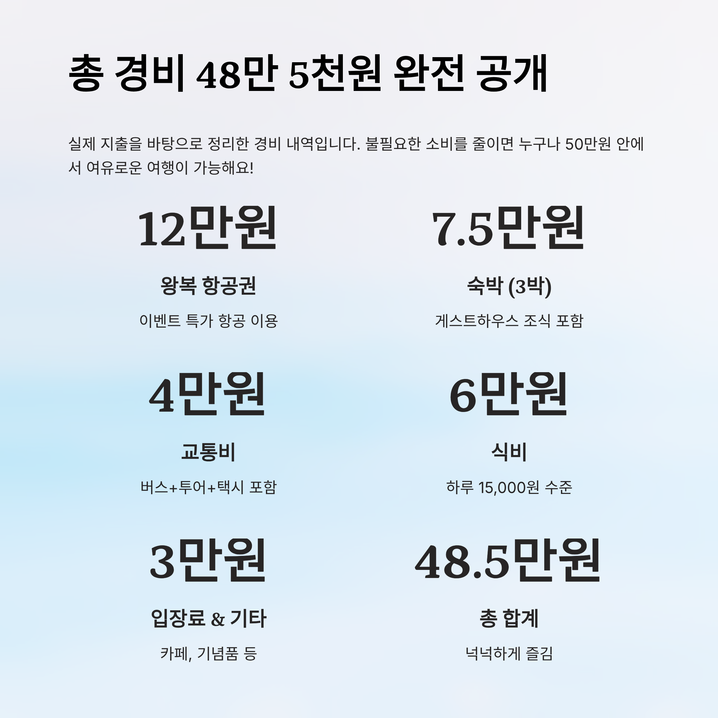 실제 지출을 바탕으로 경비를 표로 정리해봤어요. 불필요한 소비를 줄이면 누구나 50만 원 안에서도 여유로운 여행이 가능해요.