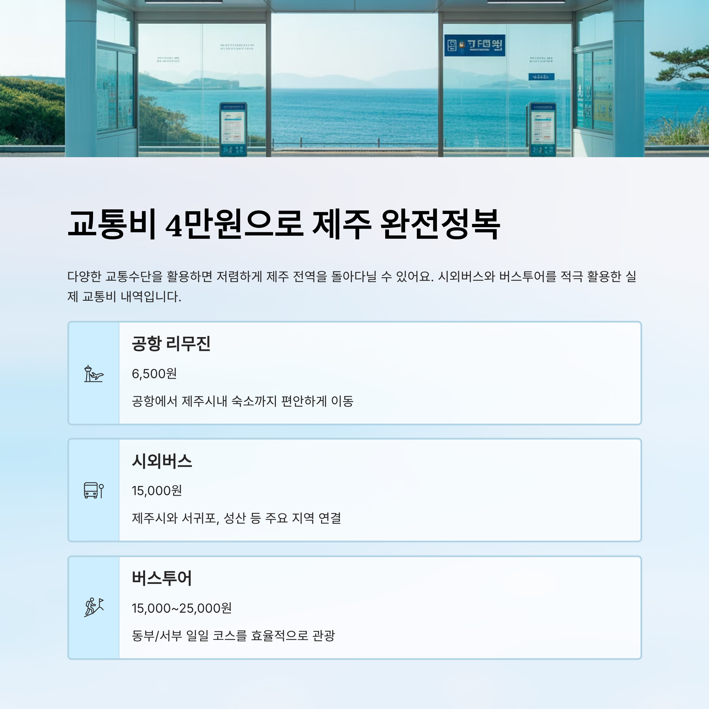 렌트카가 없어도 다양한 방법으로 제주를 돌아다닐 수 있어요. 저는 시외버스와 제주형 버스투어, 일부 택시를 병행해 총 교통비 4만 원 정도로 여행을 마쳤답니다. 아래는 교통비와 주요 루트를 정리한 표예요.