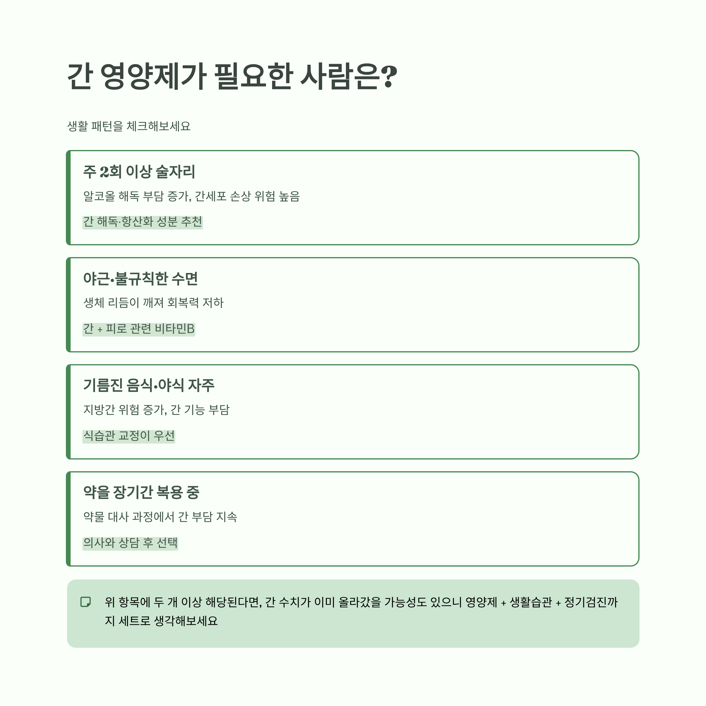 사실 모든 사람이 간 영양제를 꼭 먹어야 하는 건 아니에요. 다만 생활 패턴상 간이 혹사받기 쉬운 분들은 생각보다 많습니다. 야근과 회식이 잦은 직장인, 주말마다 술 약속이 있는 분들, 진통제·혈압약 등 장기 복용 약이 많은 분들, 밤에 야식 자주 드시는 분들까지요. 아래 표처럼 내 생활 패턴을 한 번 체크해보면, 내가 “그냥 피곤한 게 아니라 간이 힘든 상태일 수도 있겠다”는 신호를 조금 더 구체적으로 느낄 수 있어요.