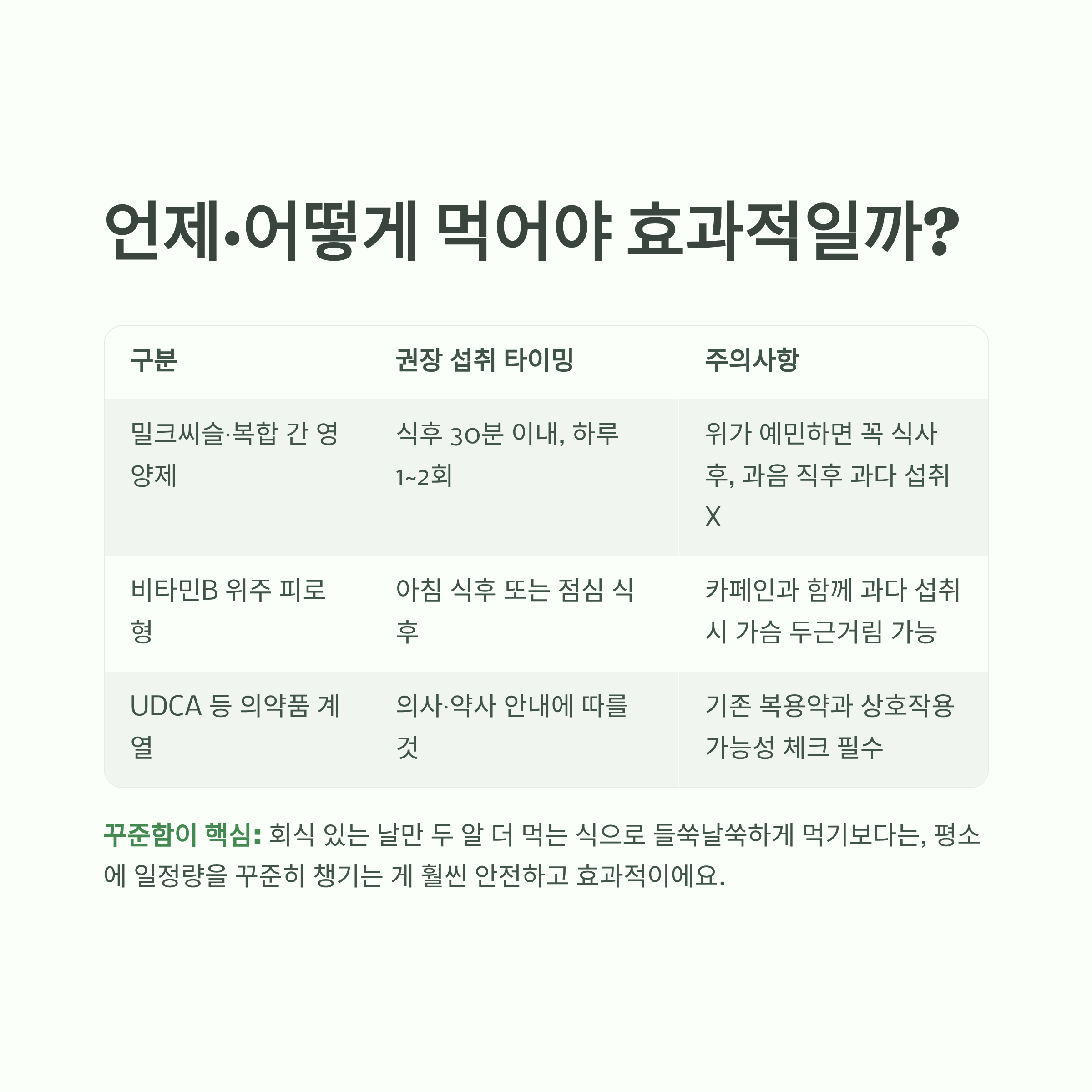 | 밀크씨슬·복합 간 영양제 | 식후 30분 이내, 하루 1~2회 | 위가 예민하면 꼭 식사 후에, 과음 직후 과다 섭취는 X |