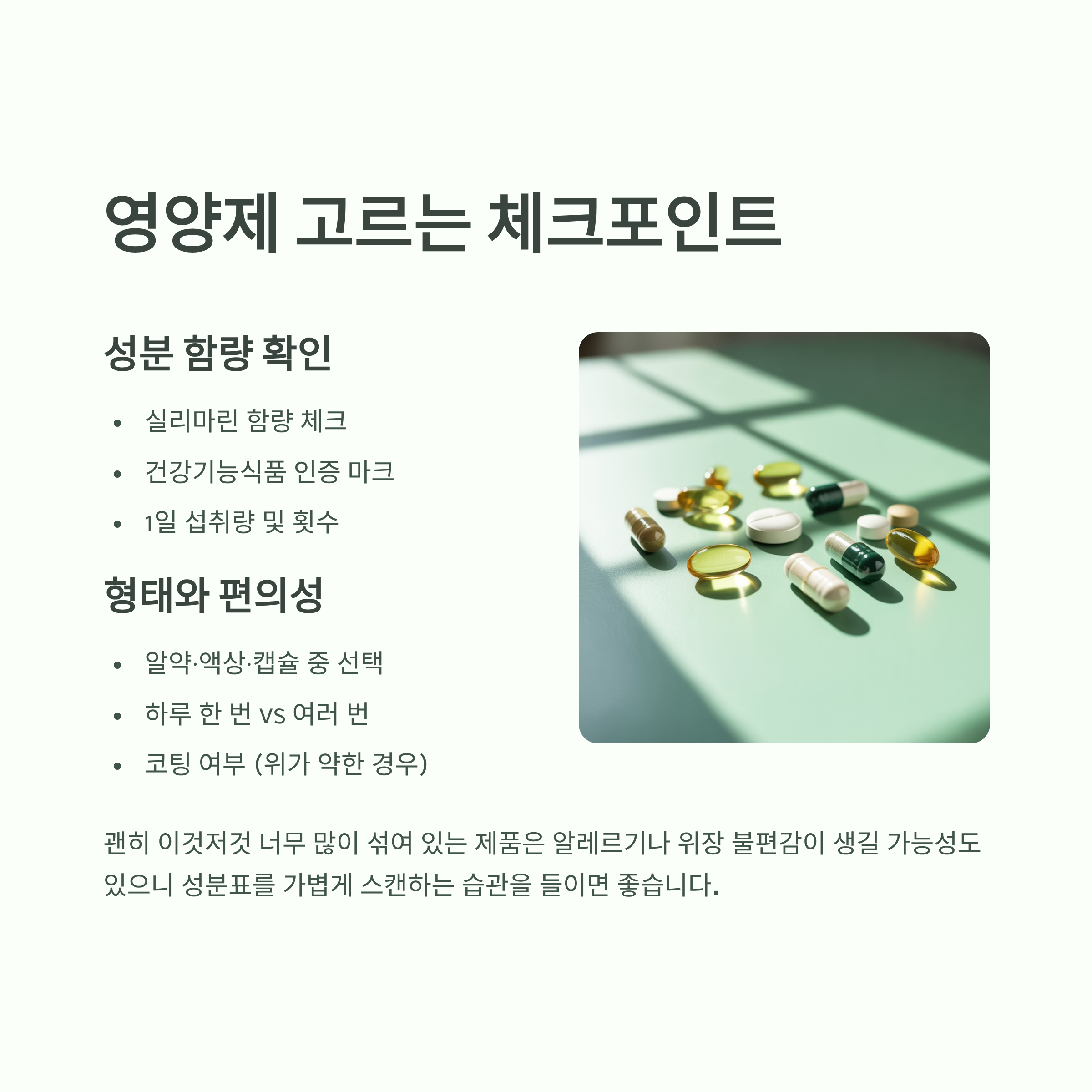검색만 해도 제품이 수십 개씩 나오니까 “그냥 리뷰 많은 걸로?” 하고 고르기 쉽죠. 근데 간 영양제는 성분 함량, 1일 섭취량, 형태(알약·액상), 부원료만 봐도 체감이 꽤 다릅니다. 예를 들어 밀크씨슬 제품이라면 실리마린 함량이 어느 정도인지, 건강기능식품 인증 마크가 있는지, 1일 몇 회 몇 정을 먹어야 하는지부터 보는 게 좋아요. 바쁜 직장인은 하루 한 번으로 끝나는 제품이 편하고, 위가 약한 분이라면 코팅이 잘 된 캡슐형이 부담이 덜 할 수 있죠. 또 괜히 이것저것 너무 많이 섞여 있는 제품은 알레르기, 위장 불편감이 생길 가능성도 있으니 성분표를 가볍게 스캔하는 습관을 들이면 좋습니다.