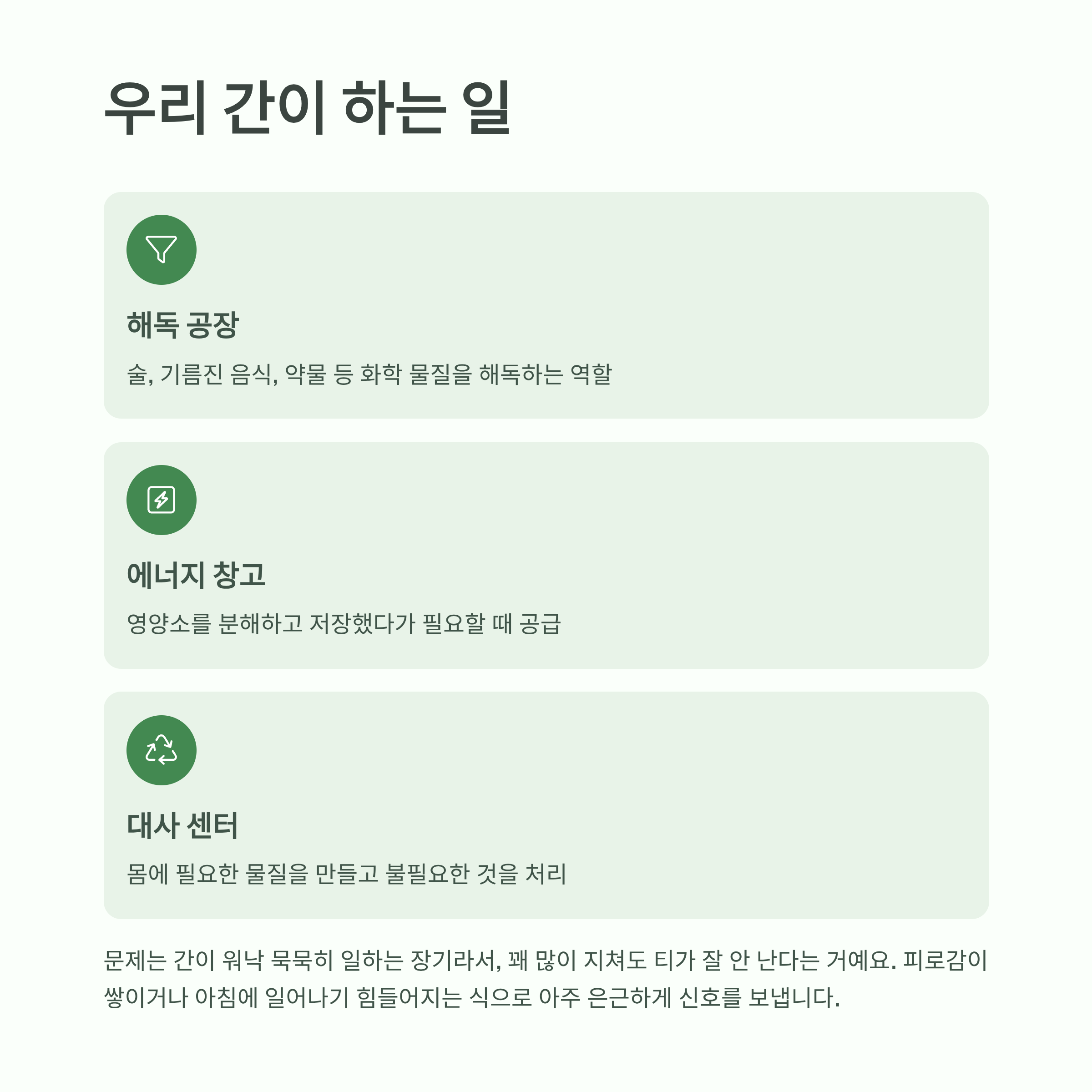 간이라고 하면 보통 “해독” 정도만 떠올리는데요, 실제로는 우리 몸의 공장 + 쓰레기 처리장 + 에너지 창고 역할을 동시에 하고 있어요. 술이나 기름진 음식, 약으로 들어온 각종 화학 물질을 해독하고, 우리가 먹은 영양소를 잘게 나눠서 필요한 곳으로 보내고, 남는 에너지는 저장했다가 꺼내쓰는 일까지 맡고 있죠. 문제는 간이 워낙 묵묵히 일하는 장기라서, 꽤 많이 지쳐도 티가 잘 안 난다는 거예요. 피로감이 쌓이거나 아침에 일어나기 힘들어지는 식으로 아주 은근하게 신호를 보내다 보니, “원래 내가 좀 피곤한 체질인가 보다” 하고 넘기기 쉽습니다. 그래서 간 건강 영양제가 괜히 유행하는 게 아니라, 미리미리 관리하려는 사람들이 늘어난 결과라고 볼 수 있어요.