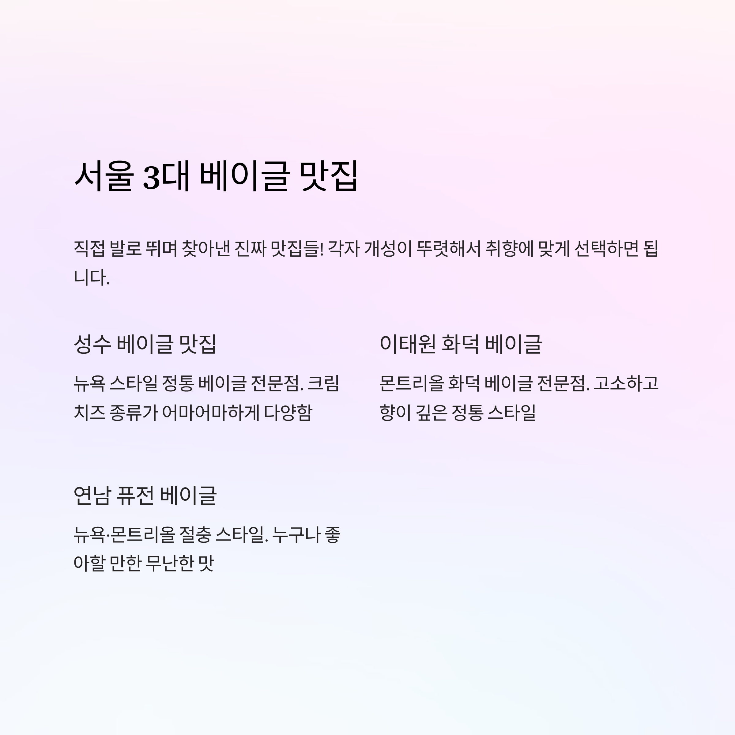 - 연남 — 퓨전 베이글로 유명. 뉴욕·몬트리올 스타일 절충 느낌이라 누구나 좋아할 맛.